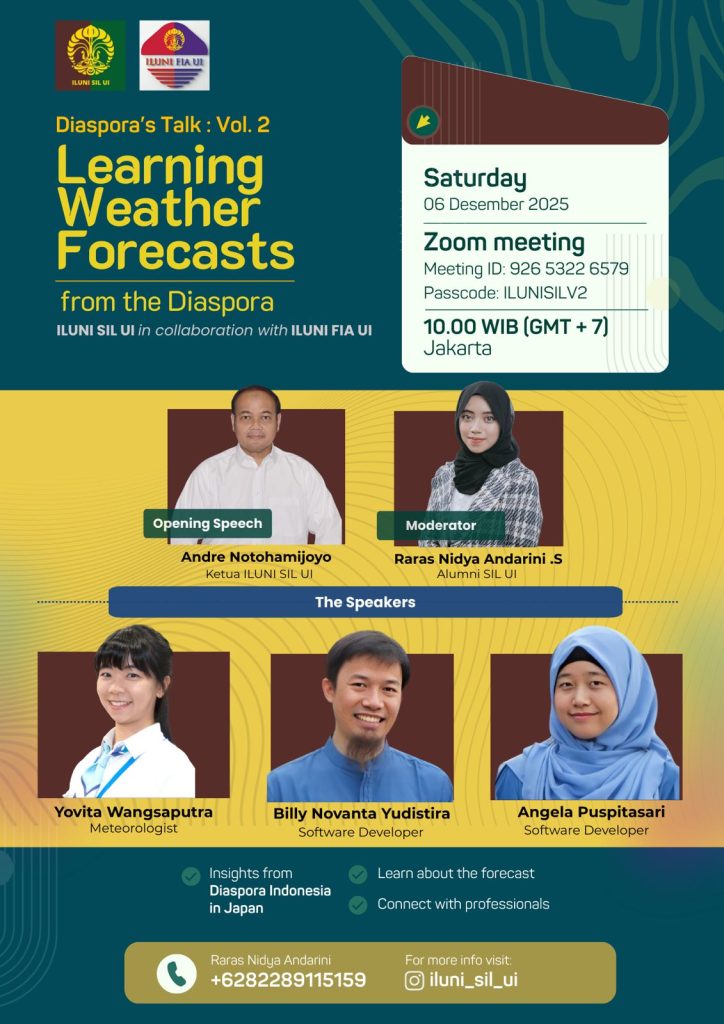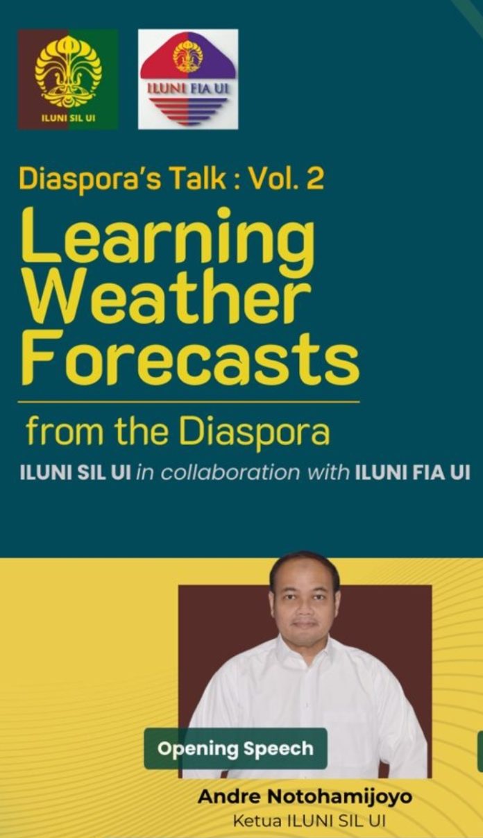 SintesaNews.com – Ikatan Alumni Sekolah Ilmu Lingkungan UI (ILUNI SIL) berkolaborasi dengan ILUNI FIA (Fakultas Ilmu Administrasi), menggelar Diaspora’s Talk: Vol. 2, bertajuk “Learning Weather Forecasts” from the Diaspora. Kegiatan ini berlangsung Sabtu, 6 Desember 2025, pukul 10.00-12.00 WIB, via zoom.