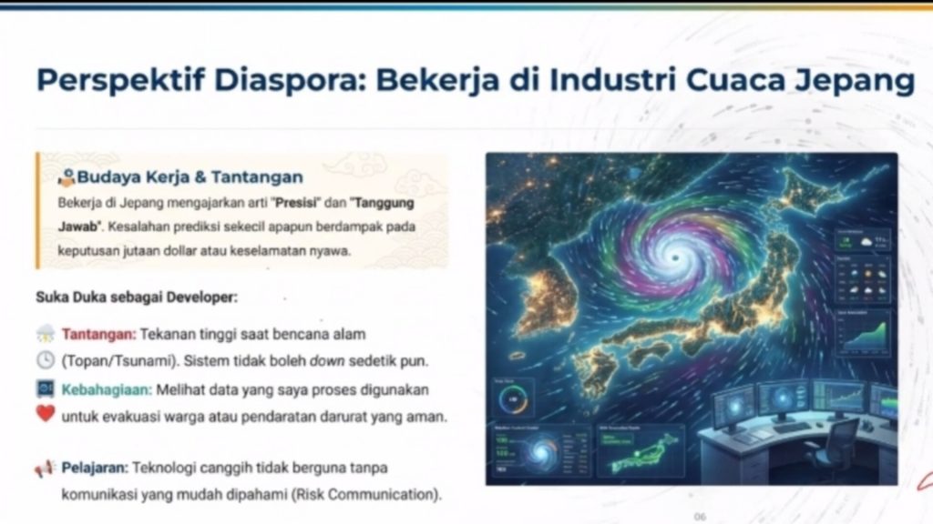Acara ini menghadirkan perspektif menarik dari tiga narasumber berpengalaman, antara lain: Yovita Wangsaputra (Meteorolog), Billy Novanta Yudistira (Software Developer), dan Angela Puspitasari (Software Developer). Para narasumber berbagi pengalaman dan pengetahuan mereka dalam bidang prediksi cuaca dan teknologi di Jepang.