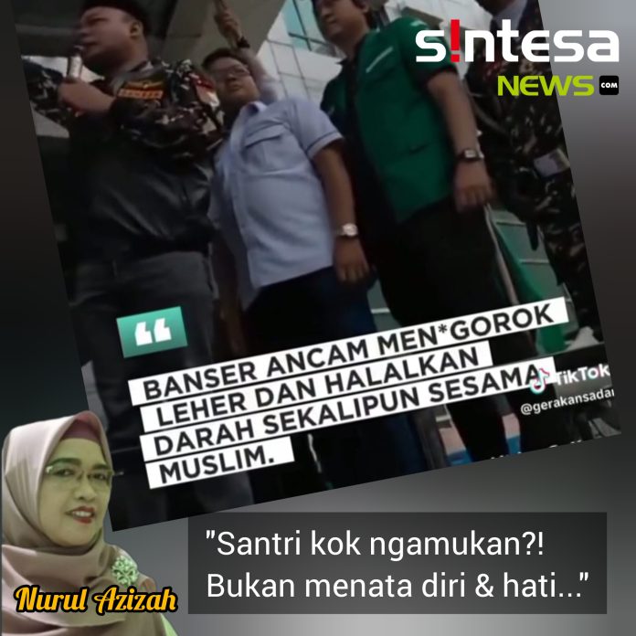 Penulis merasa sedih saja, ada kelompok tertentu yang mengatas namakan Banser dan Pemuda Anshar “ancam menggorok leher dan halalkan darah sekalipun sesama muslim.” Sedih saja melihatnya. Bagi orang awam mereka tahunya ya santri, tapi kok “ngamuk” dengan kata-kata tak terkendali. Apalagi perkataan itu telah direkam dan posting di banyak platform media sosial.