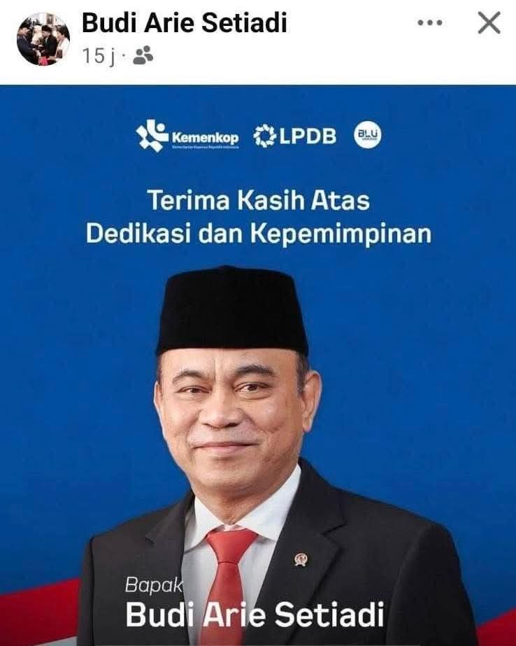 Usai serah terima jabatan Menkop, Budi Arie memposting ucapan terimakasih kepada dirinya sendiri di laman akun medsosnya.