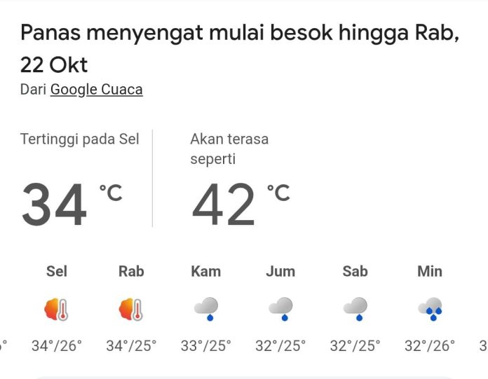 SintesaNews.com – Berdasarkan prediksi dari Google, besok 20 Oktober 2025 di wilayah Jabodetabek, suhu udara akan panas menyengat.